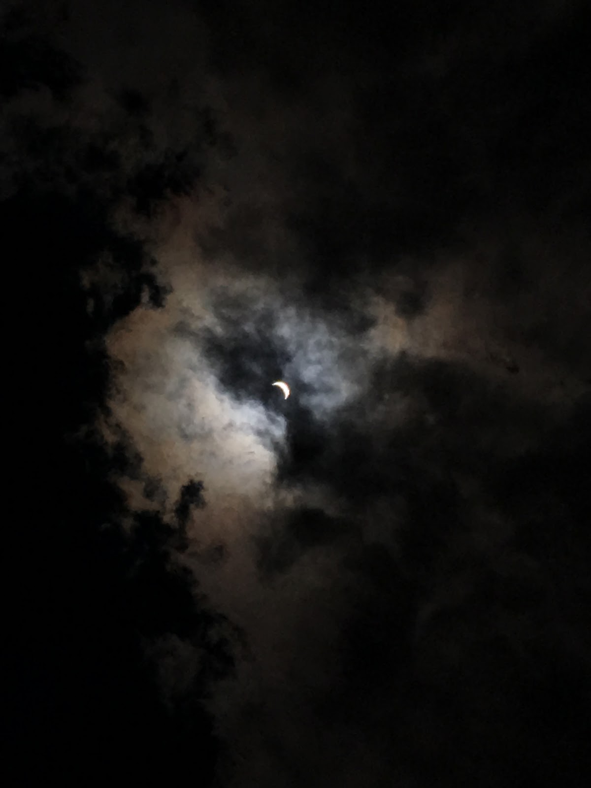 We hustled south to an area where it was clear and we were able to see it right at peak and then the light clouds made it so we could see the eclipse without the boxes. it was a very cool sight. WE were so blessed to be able to witness such a rare event.