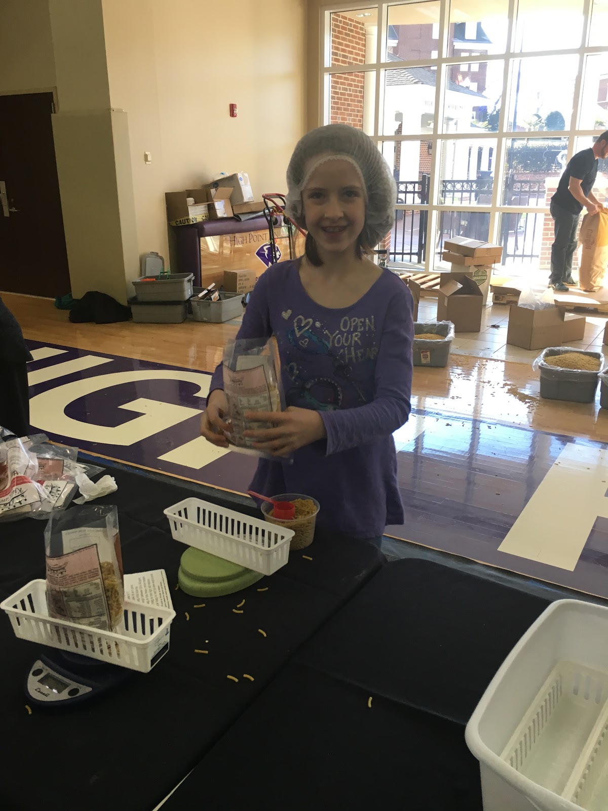 Another community service project that Olivia took part in was on Martin Luther King, Jr. Day at High Point University. The students and faculty organized a drive to package ready-to-cook meals for disaster relief. They had several tables set up to assemble the meals in bags, which were then heat-sealed and boxed up. The meals were a simple pasta meal with soy protein and powdered sauce, so that all it needed was boiling water to be made.
